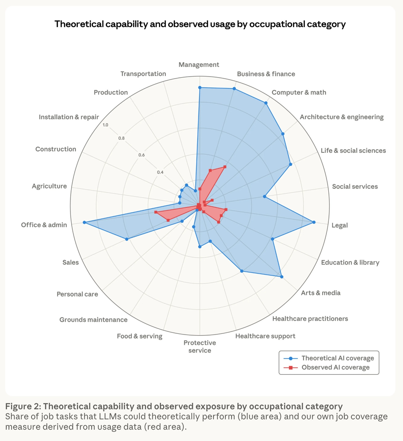 ² Anthropic, “Labor Market Impacts of AI: A New Measure and Early Evidence,” March 2026. Figure 2: Theoretical capability and observed exposure by occupational category. anthropic.com/research/labor-market-impacts