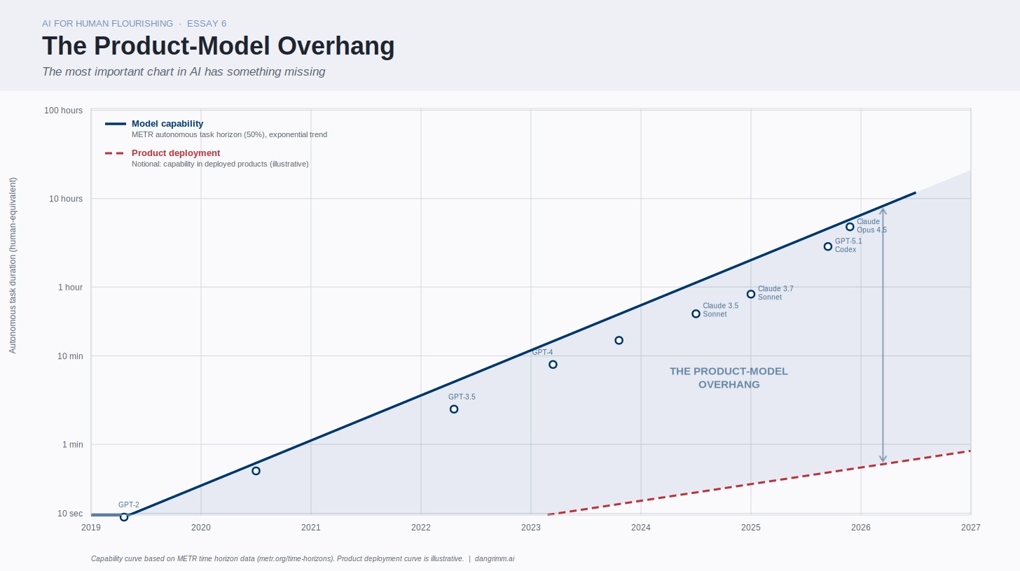 But something is missing from the chart. There is no second curve showing product deployment. No line tracking how much of that capability has been put to use in the form of products with usable interfaces, access to data, tool-calls, identity, connectivity, etc. that solve real users’ problems. If you drew one, the gap between the two would be enormous. That gap is a product-model overhang. Model capability is the latent resource. Product is the bottleneck.
