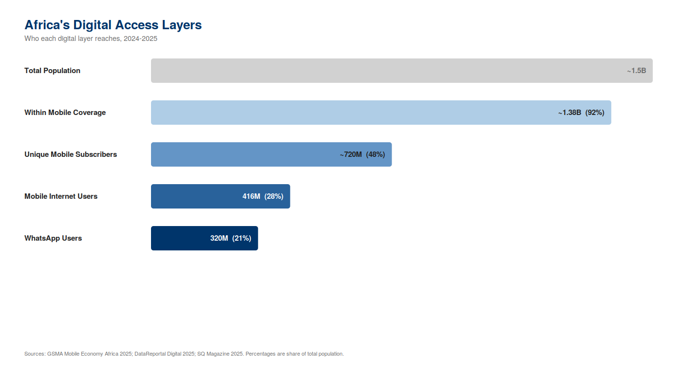 Africa has 416 million mobile internet users at just 28% penetration. 960 million more people live within mobile coverage but do not use mobile internet.9